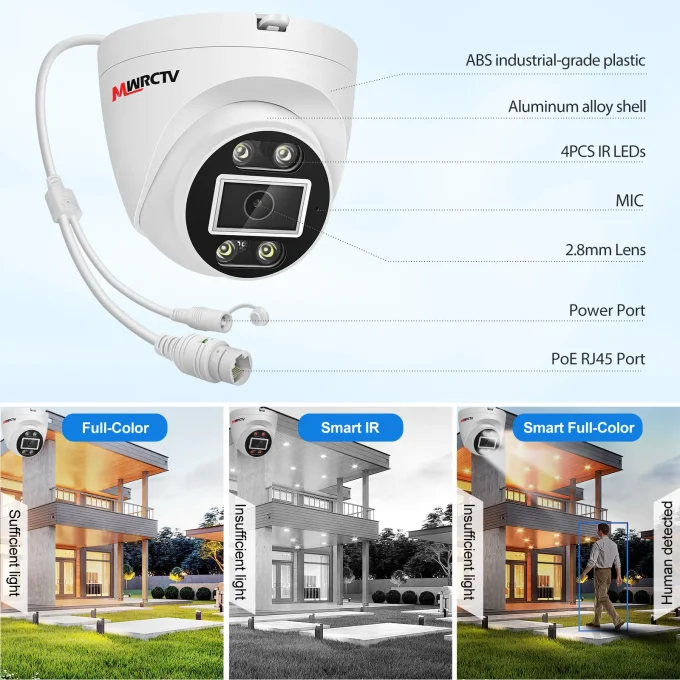 【HD 4MP PoE Cameras &Color Night Vision & Two-Way Audio】 This 4MP HD ip camera with 1/3″ latest technology CMOS sensor and chipset,delivering sharp, detailed footage day and night.2.8mm 110°wide angle lens allows you to cover more ground.Camera default Smart Color Night Vision mode:Infrared (IR) works normally at night, and the white light activates only when movement is detected, providing clear,full-color images during alerts.Built-in two-way audio lets you communicate remotely, whether greeting visitors or deterring intruders.(Note This is a FIXED IP Camera)
