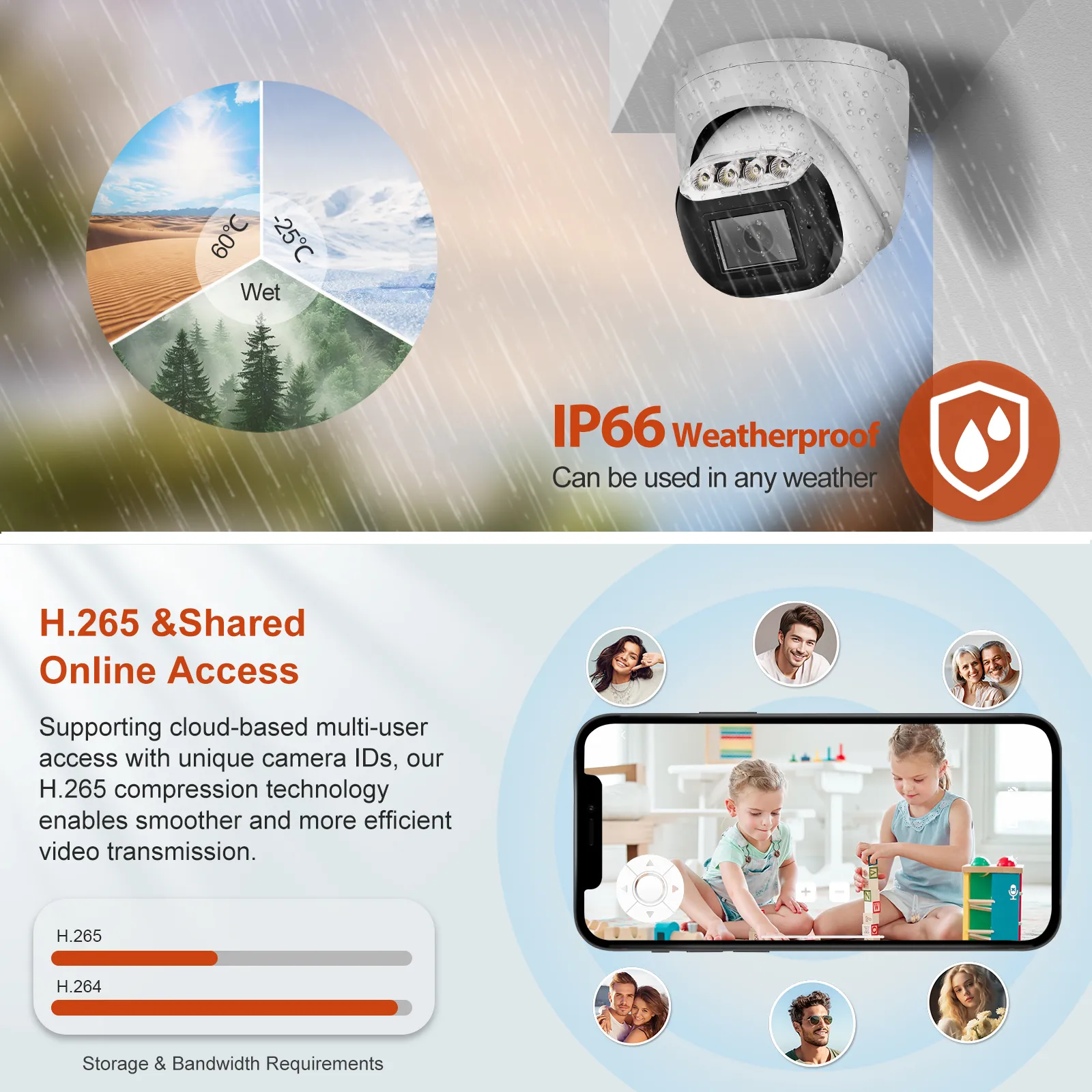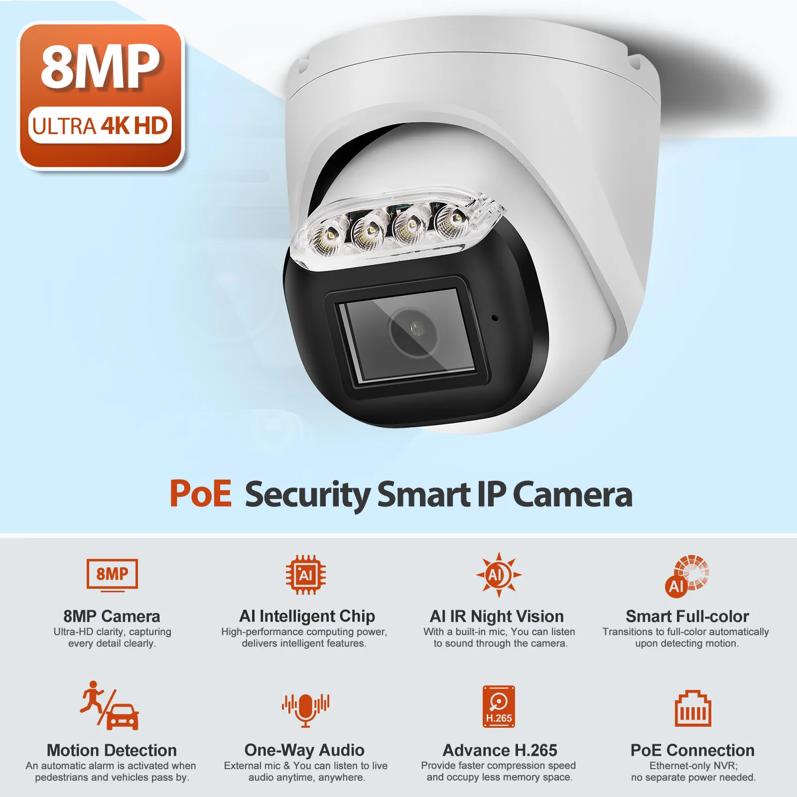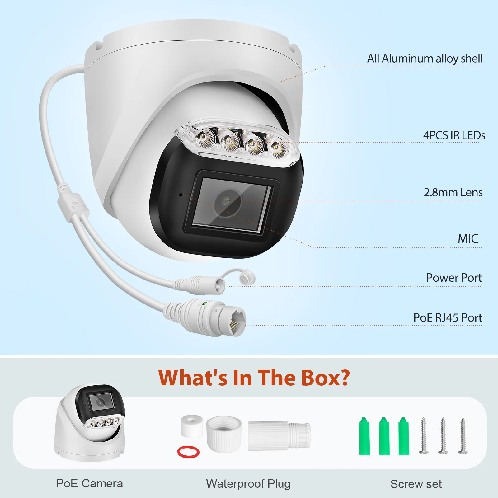 This high-performance 8MP dome security camera delivers Ultra HD 3840*2160 resolution through its advanced 1/2.8″ CMOS sensor and latest image processing chipset. The starlight-grade lens provides exceptional low-light performance, capturing clear images even in near-darkness (0.01 Lux). The camera’s rugged IP66-rated metal housing withstands harsh weather conditions (-30°C to 60°C) for reliable outdoor operation. Compatible Hikvision Eyessys Dahua Reolink NVR.